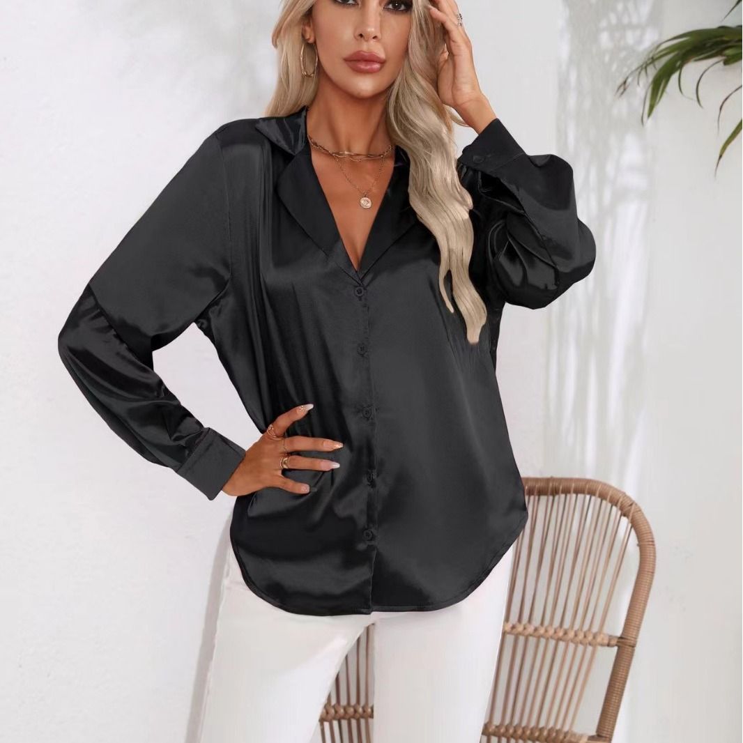New style of women's satin imitation silk long sleeved shirt with a suit collar and color scheme